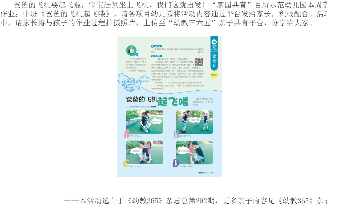 爸爸的飞机要起飞啦,宝宝赶紧坐上飞机,我们这就出发!“家园共育”百所示范幼儿园本周亲子作业:中班《爸爸的飞机起飞喽》。请各项目幼儿园将活动内容通过平台发给家长,积极配合。活动中,请家长将与孩子的作业过程拍摄照片,上传至“幼教三六五”亲子共育平台,分享给大家。